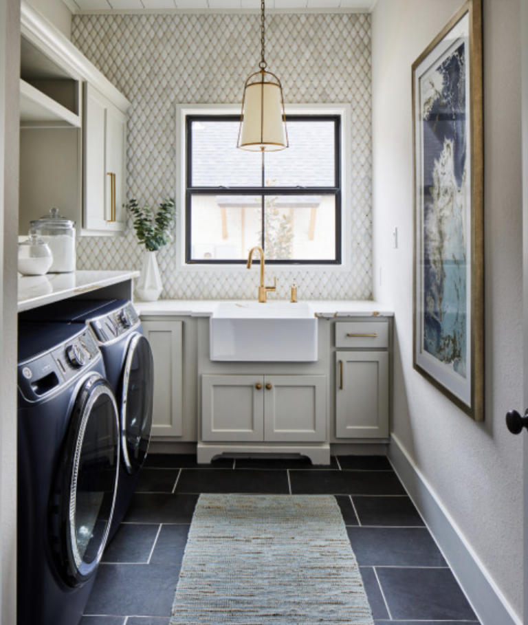 Kurk Homes imagined a welcoming, joyful and functional space when designing this College Station, Texas, laundry room. Black porcelain tile flooring, quartz countertops, shiplap ceiling panels and a backsplash that combines stone, brass and porcelain details in a harlequin pattern layer in the luxury.
