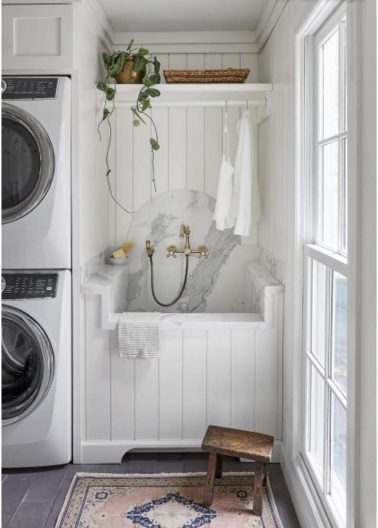 Stacking the washer and dryer left room for Trim Tech Designs to outfit this Chicago-area laundry room with a deep and wide marble-lined utility sink that could double as a washing station for small pets. The arched marble backsplash, tongue-and-groove paneling and a wall-mounted faucet with attached sprayer bring elegant touches to the space.