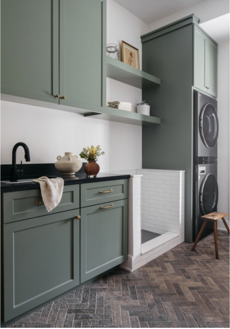 M House Development used a similar strategy to make room for a dedicated pet-washing station in this Chicago-area mudroom. But the finishes here nod to English Country style — sage green cabinetry, brass hardware, black countertops and a herringbone brick floor.