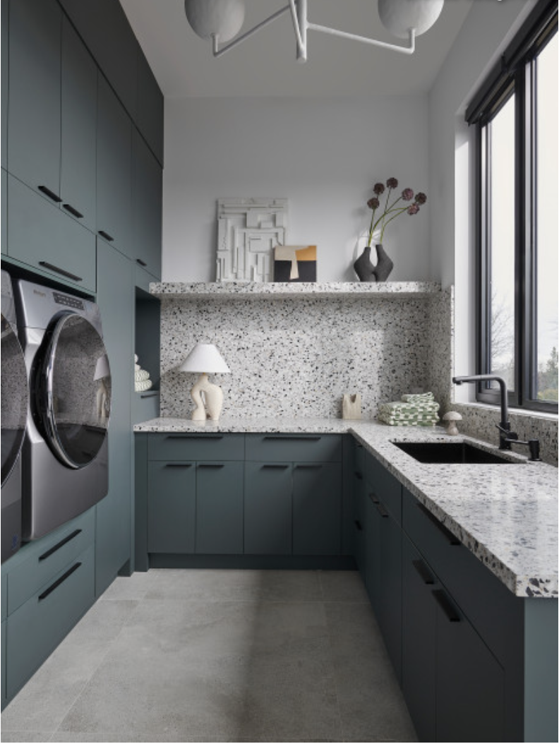 This Toronto-area laundry room by Avenue Design features elevated machines that minimize bending over while loading and unloading. As for style, terrazzo countertops, backsplash and floating shelf add pizazz with tones that complement the gray-green cabinetry, streamlined hardware and sculptural light fixture.