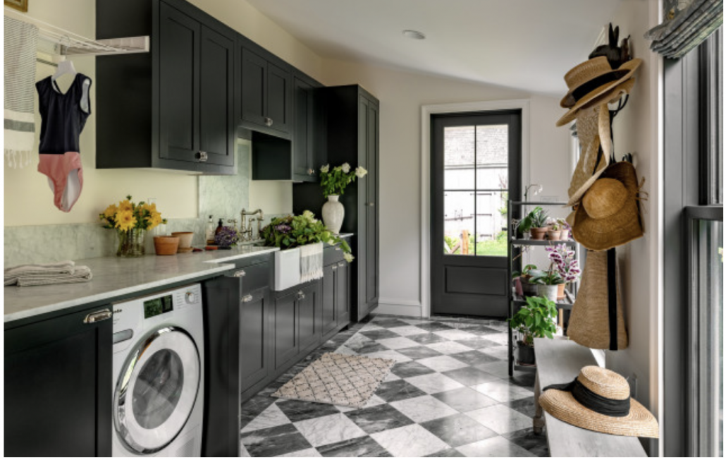 Marble plays a starring role in this Litchfield, Connecticut, combined mudroom and laundry room by Crisp Architects. The countertops are honed Carrara marble and the striking checkerboard floor is composed of honed 12-by-12-inch Gioia Venatino and Dark Bardiglio marble tiles. One of the most clever features is slide-away pocket doors that conceal the appliances when they’re not in use.