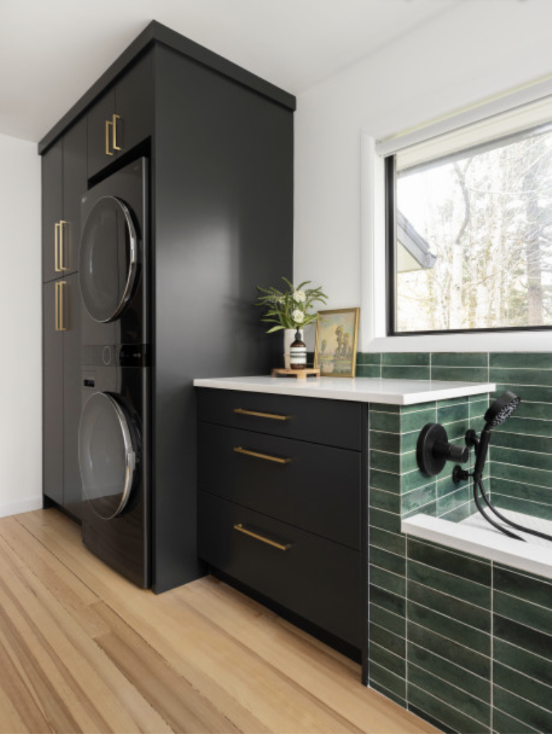 These Portland, Oregon, homeowners wanted overflow pantry and storage space, a front-loading washer and dryer, counter space for folding laundry and a dog bath. To fulfill their needs, they searched Houzz and found Amy Pearson Design. The firm carefully considered the ergonomics of dog washing when determining the height of the doggy bath to make things easier on the owners’ backs. Its placement under the large window provides a lovely view, while the deep green tile bath surround plays off the foliage outside.