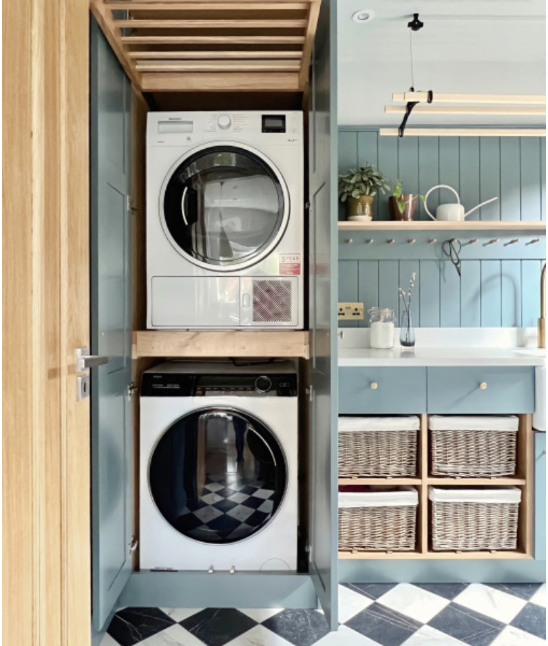 A mix of robin’s-egg blue walls and cabinets, light wood accents, fabric-lined wicker drawers, a checkerboard floor and tongue-and-groove paneling create inviting country style in this Nottingham, England, laundry room by First Sense Interiors. A pullout drying rack, countertop space for folding,a row of pegs and an open shelf maximize functionality in the well-planned room.