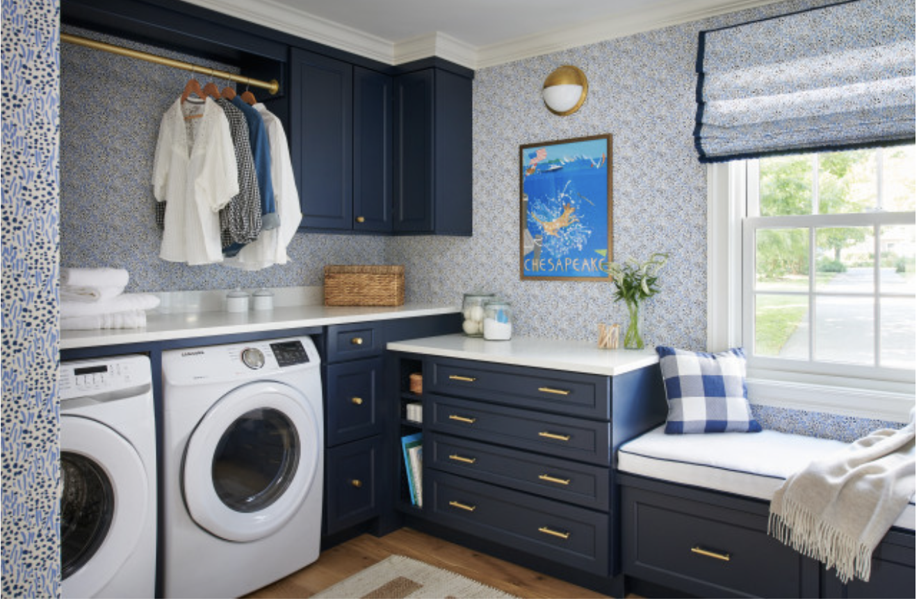 The navy, brass and white palette in this Annapolis, Maryland, laundry room by Melissa McLay Interiors and Mueller Homes nods to nautical style. But the abstract botanical wallpaper and fabric shade, dog poster, plaid pillow and white oak floors add softness, whimsy and warmth. There’s even a convenient gift wrapping station.