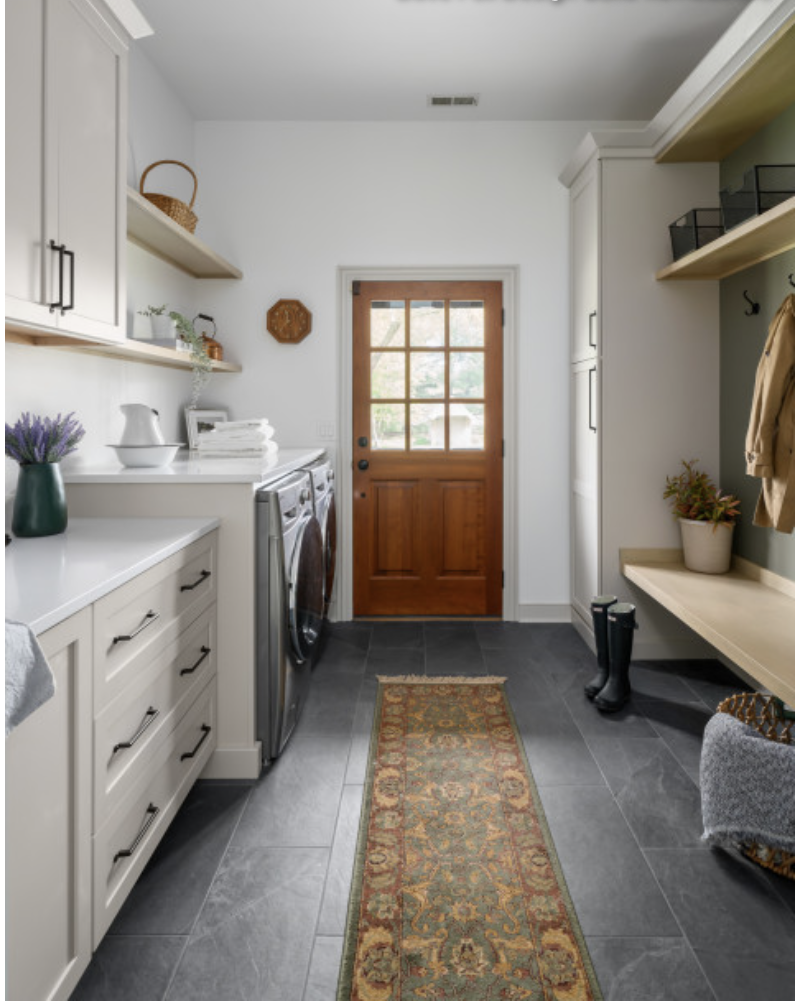 Dave Fox Design Build Remodelers gave this Columbus, Ohio, laundry-mudroom a timeless and well-worn feel. Slate flooring, an Oriental runner, wood accents, oyster-colored Shaker-style cabinets, oil-rubbed bronze hardware and vintage antiques make for an inviting farmhouse look.